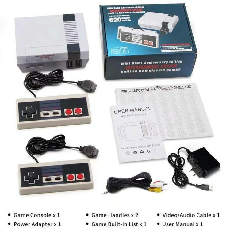 مینی کنسول میکرو مدل Anniversary Edition شامل 620 بازی کلاسیک از کنسولهای میکرو، نینتندو، سگا و... است که با کیفیت مطلوبی در صفحه نمایش تلویزیون اجرا می شود. این دستگاه شامل دو دسته بازی، یک آداپتور همراه با کابل برق است و توسط یک رابط AVI به تلویزیون های خانگی متصل میشود و شمارا به خاطرات خوش قدیم دعوت می کند. این کنسول شامل بازی های نوستالژی و خاطره انگیزی مثل قارچ خور ، بمبر من ، شورش در شهر و ... است ، همچنین همراه با دودسته یک آداپتور برق به همراه کابل و یک کابل تصویر برای شما ارسال می شود .